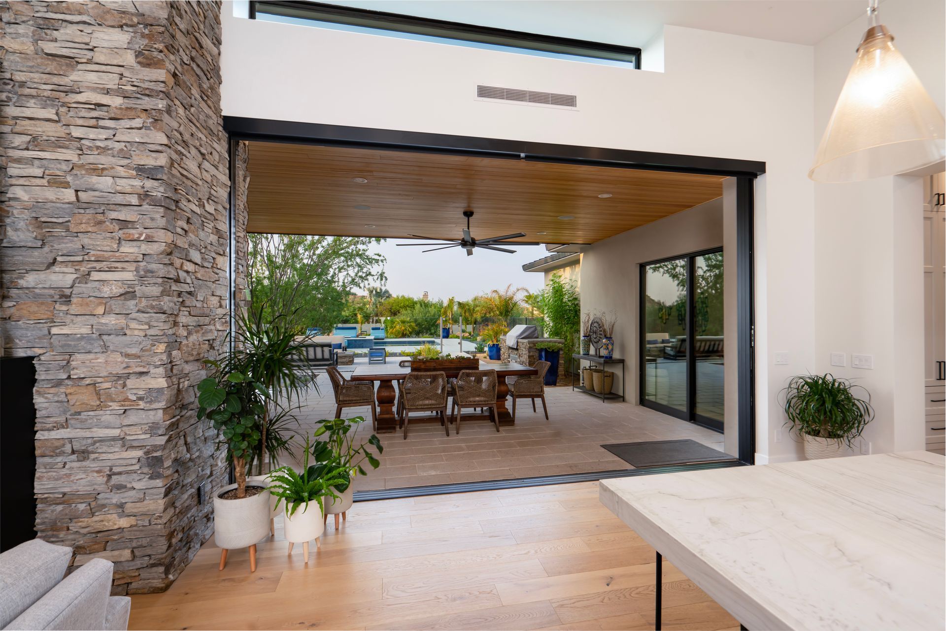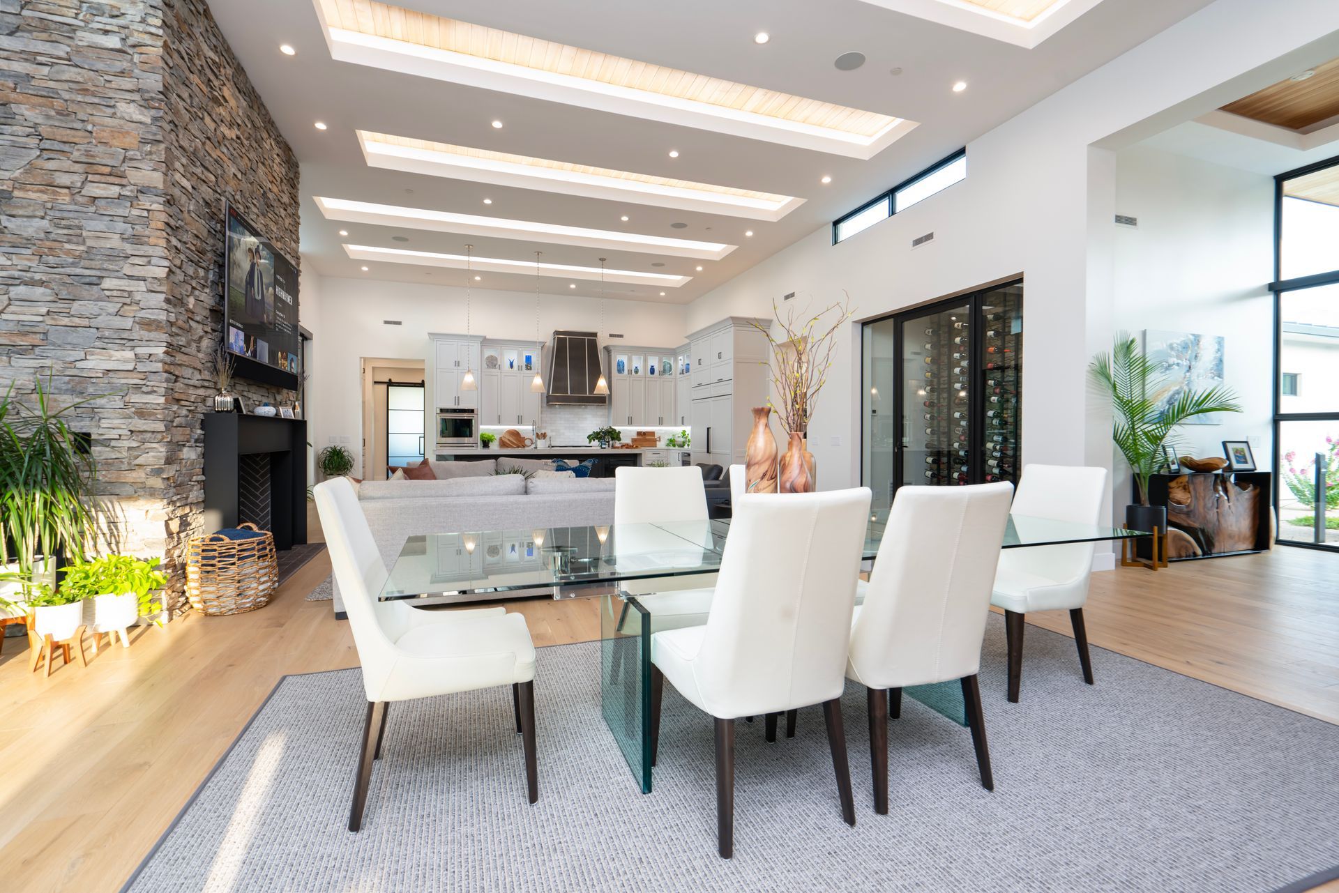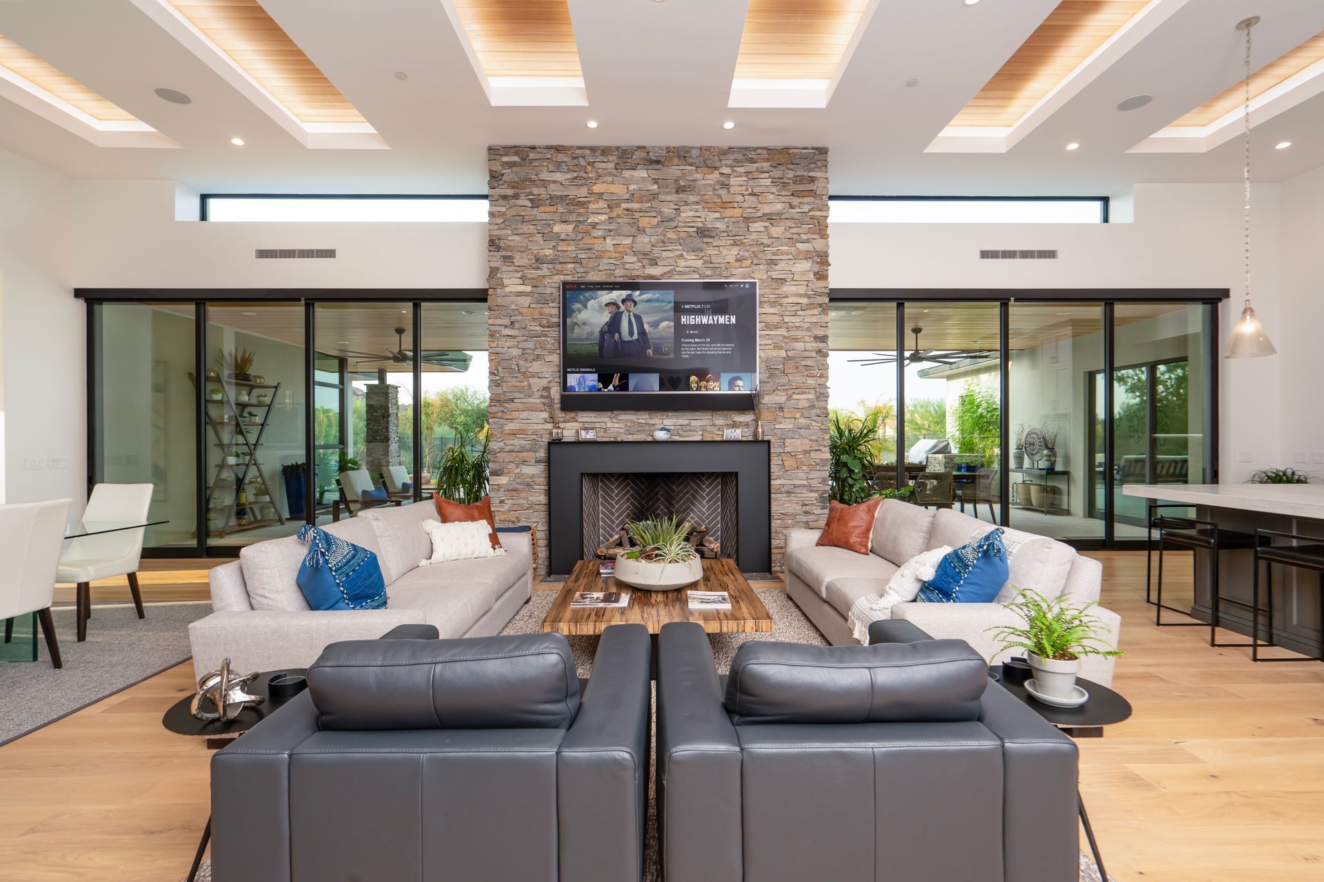 With a goal of creating a home for entertaining while maintaining levels of privacy for the bedrooms, the design incorporates split bedroom wings with an amazing central space that allows for all types of gatherings. Double sliding glass pocket doors disappear into the stone fireplace and open up the entire entertaining area to the covered patio and pool. Clerestory windows placed high in the great room allow natural light to fill the space. Recessed ceiling panels with perimeter lighting create a dramatic rhythm of contrasting depth and material across the entire entertaining space.