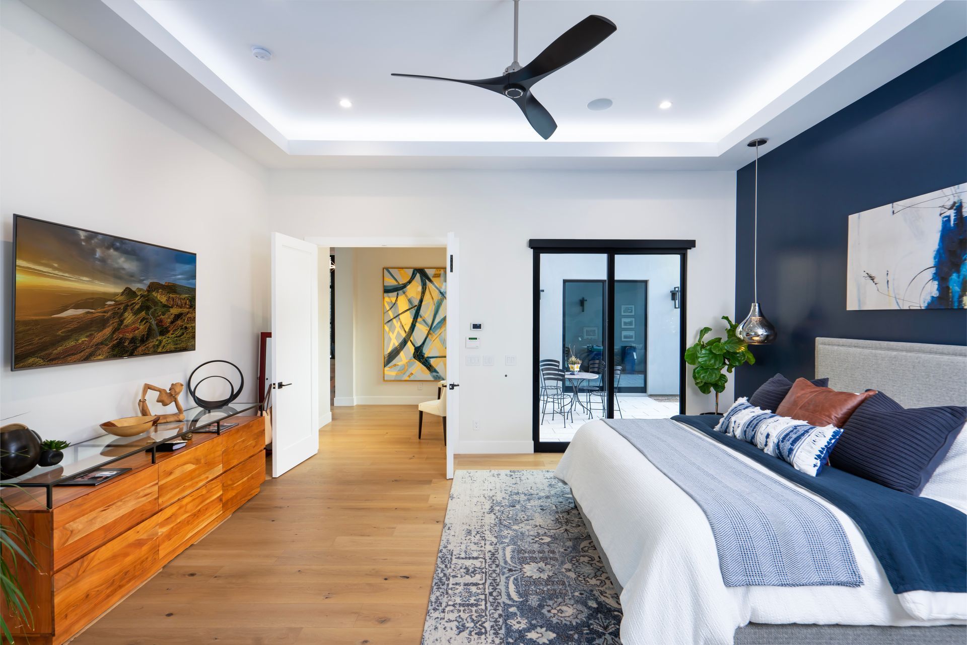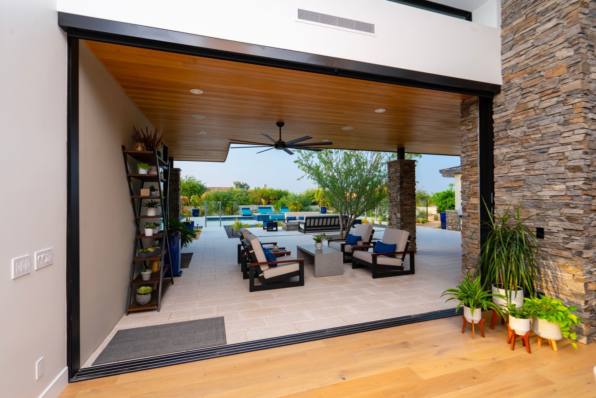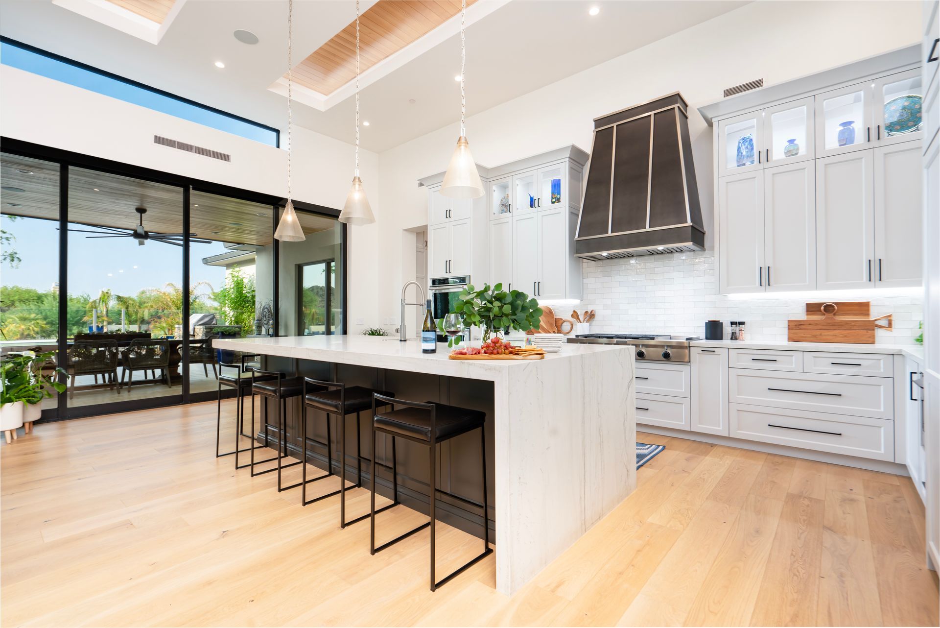 With a goal of creating a home for entertaining while maintaining levels of privacy for the bedrooms, the design incorporates split bedroom wings with an amazing central space that allows for all types of gatherings. Double sliding glass pocket doors disappear into the stone fireplace and open up the entire entertaining area to the covered patio and pool. Clerestory windows placed high in the great room allow natural light to fill the space. Recessed ceiling panels with perimeter lighting create a dramatic rhythm of contrasting depth and material across the entire entertaining space.