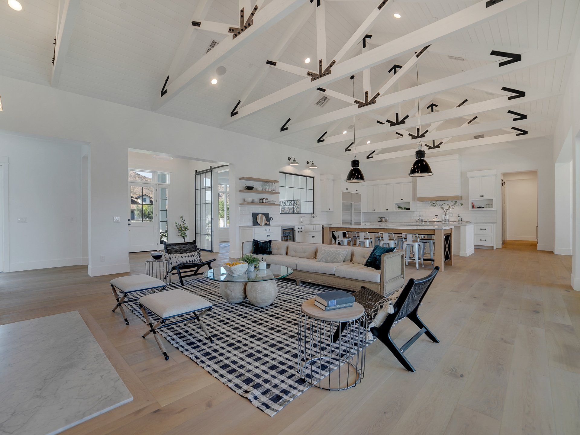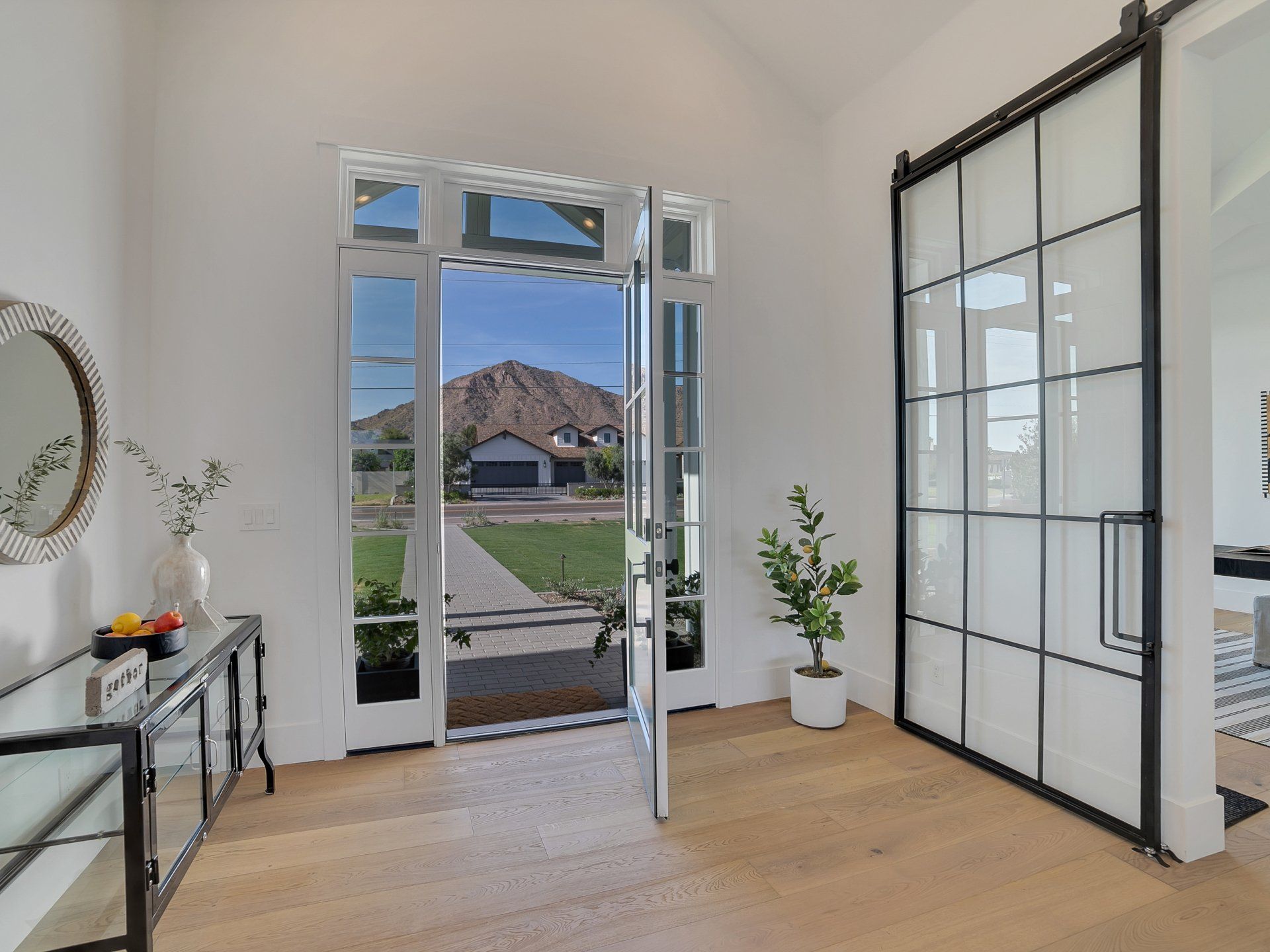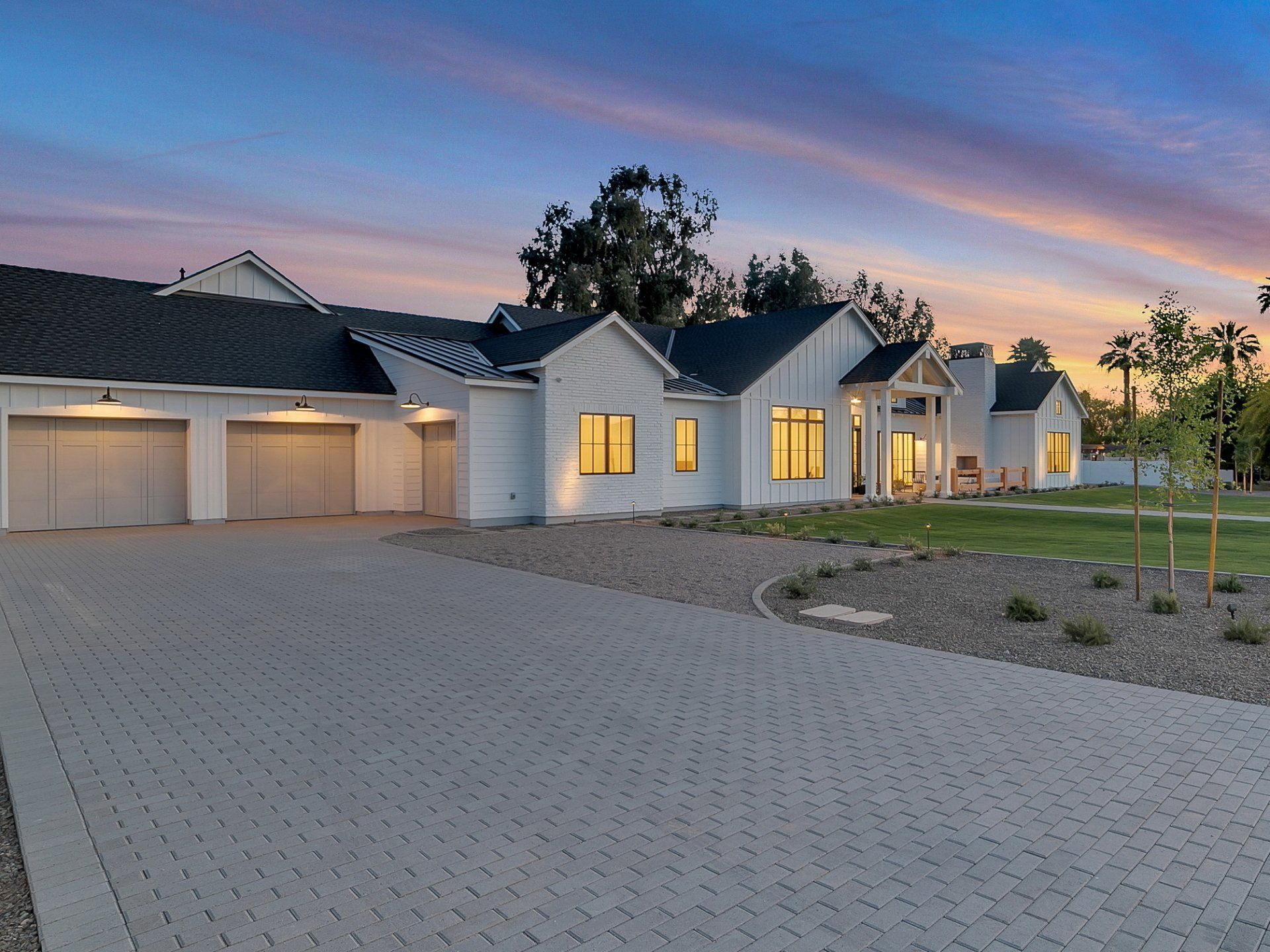 This incredible custom home is located in the Arcadia area with stunning views of Camelback Mountain. Steeply pitched roof lines, a combination of different roofing materials, roof gables, board and batten siding, white painted brick, and custom timber trusses were combined to create a stunning modern farmhouse.