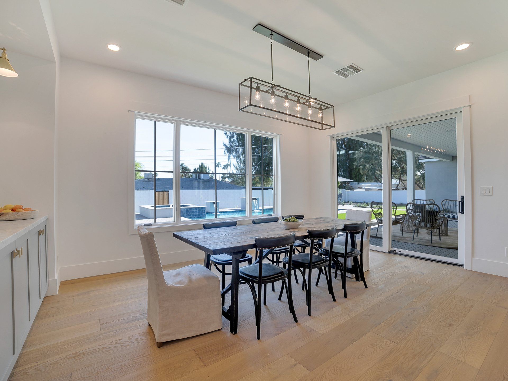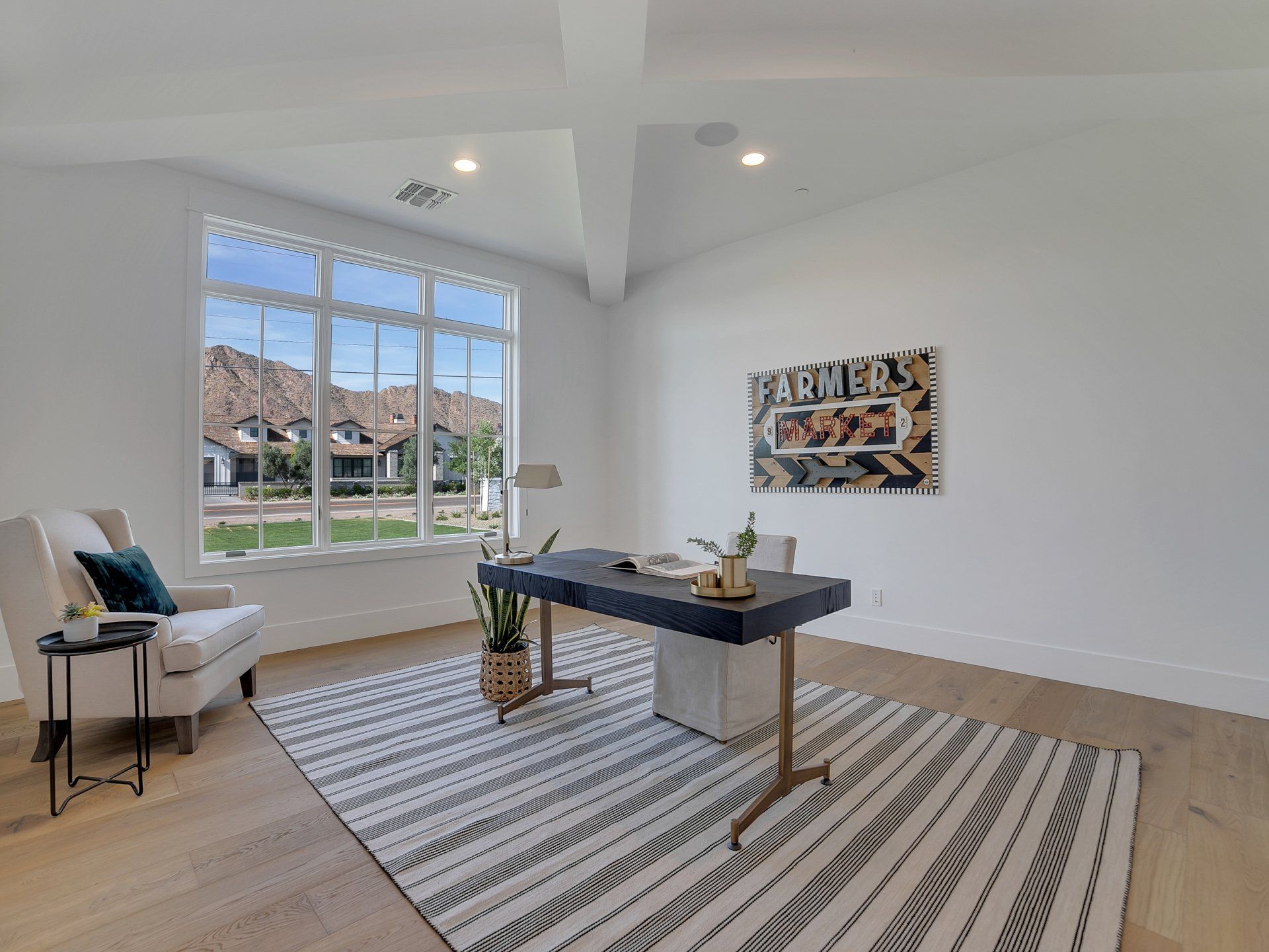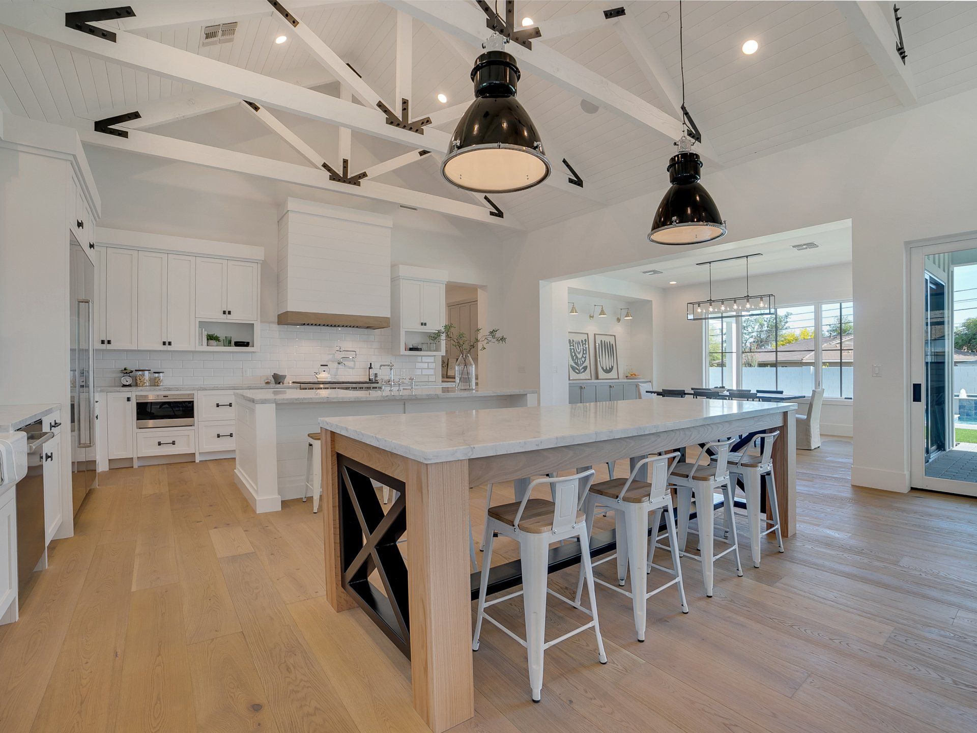 This incredible custom home is located in the Arcadia area with stunning views of Camelback Mountain. Steeply pitched roof lines, a combination of different roofing materials, roof gables, board and batten siding, white painted brick, and custom timber trusses were combined to create a stunning modern farmhouse.