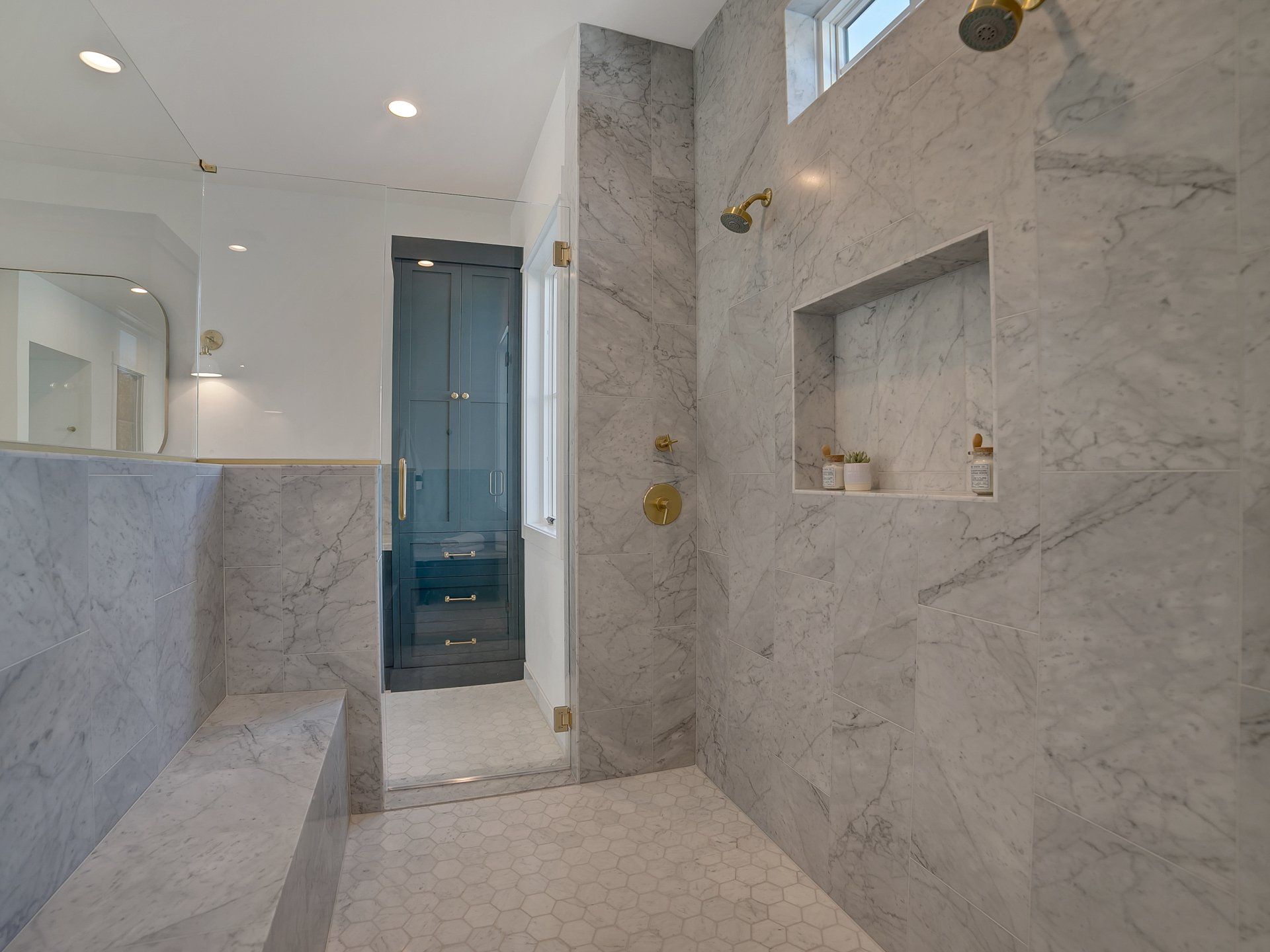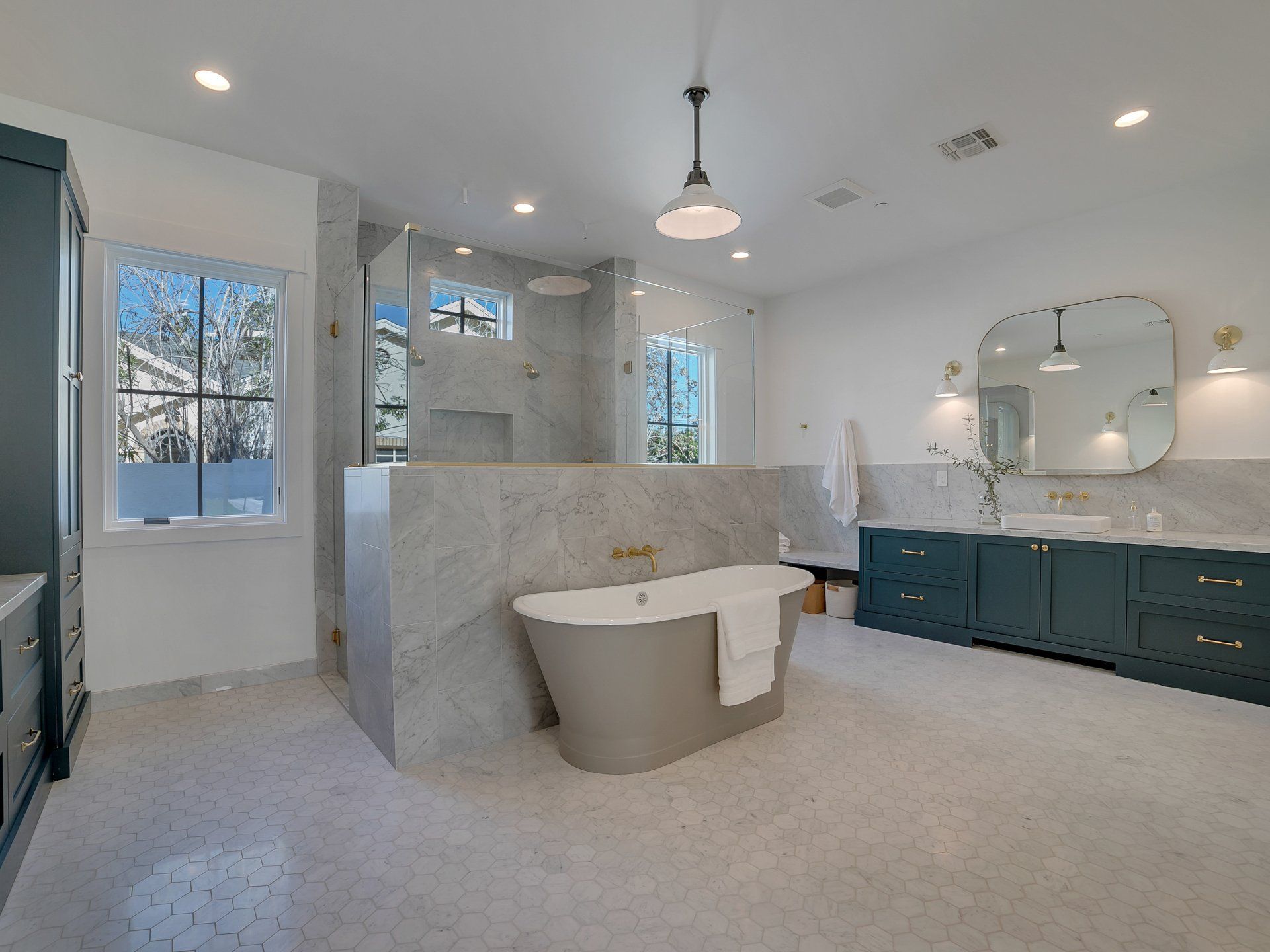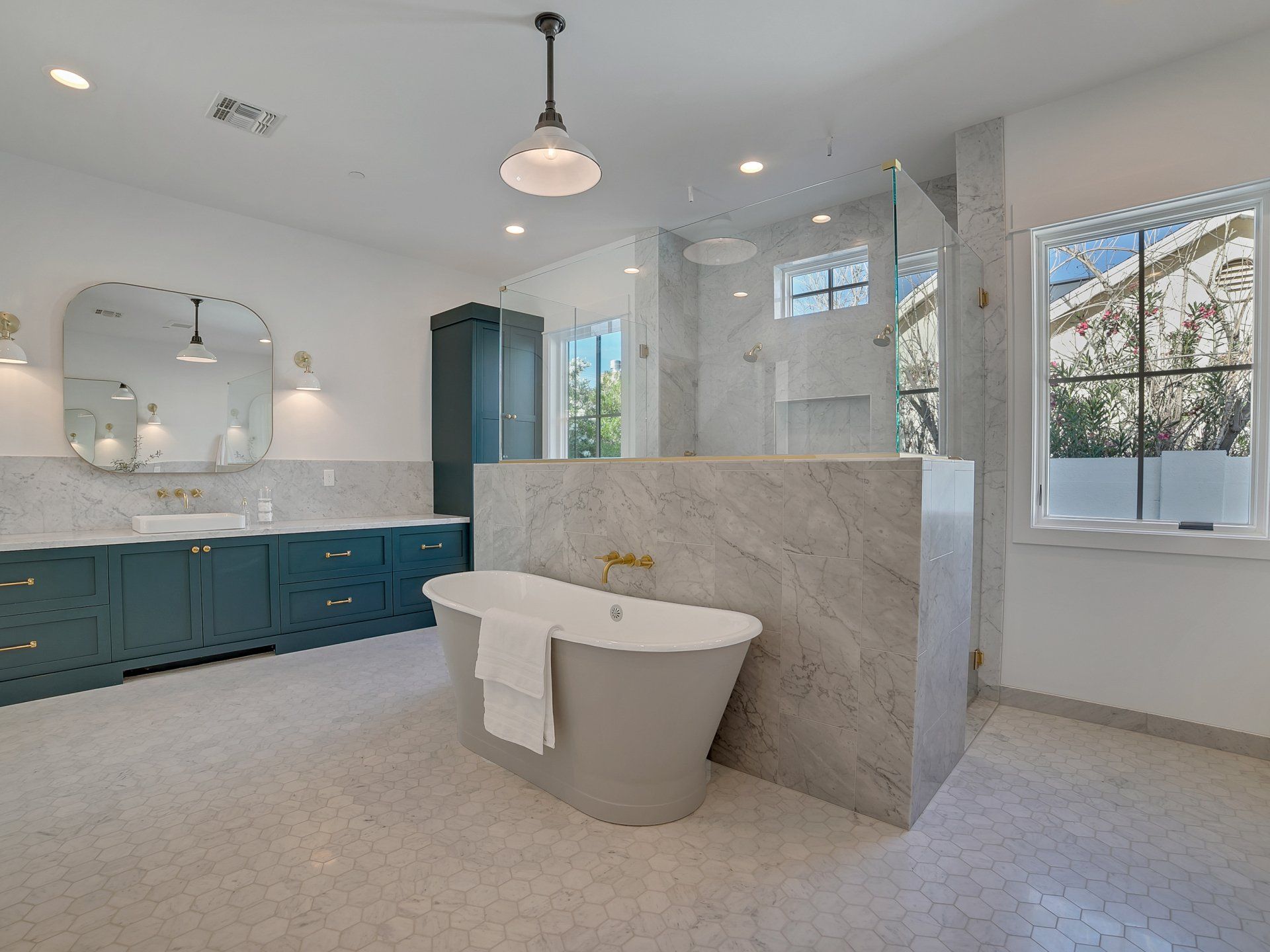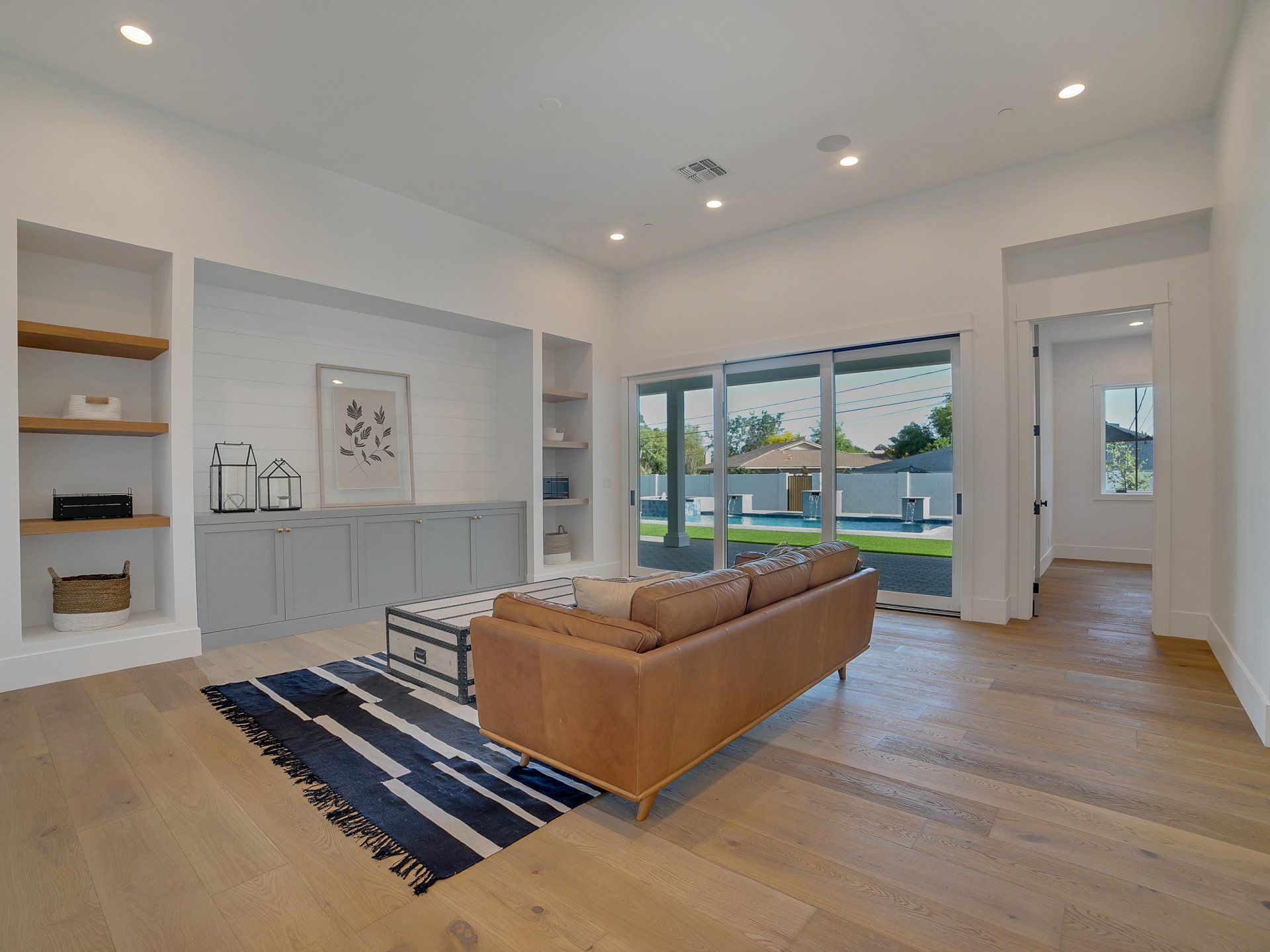 A bold clean aesthetic was carried throughout the project. Custom timber trusses with exposed hardware, white walls, soft toned stone, and wood ceilings provide a clean canvas to highlight the artwork and furnishings. Extensive use of windows and operable glass panels lead out to a front courtyard and the rear entertaining/pool area allowing easy connection to outdoor spaces and differing levels of privacy.